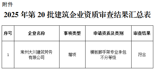 根据《中华人民共和国建筑法》、《中华人民共和国行政许可法》、《建筑业企业资质管理规定》(部令第22号)、《建筑业企业资质标准》(建市〔2014〕159号)等法规及有关规定,现将我局审查的2025年第20批建筑业企业资质结果予以公告。