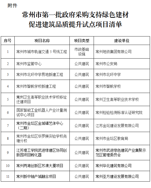 2022 年11 月,我市被财政部、住建部、工信部列为政府采购支持绿色建材促进建筑品质提升试点城市,根据创建要求,为加快推广绿色建材发展应用,促进我市建筑品质整体提升,市财政局等部门下发了《常州网络十大博彩公司采购支持绿色建材促进建筑品质提升试点工作实施方案》(常财购〔2023〕18号),明确了我市绿色建材试点城市创建的目标任务、工作内容、保障措施等内容。根据实施方案要求,我市优先选取了政府投资立项的医院、学校、办公楼、保障性住房等政府采购工程项目作为政策实施试点项目,并经市绿色建材试点工作专班筛选,在全市范围内确定11个试点工程项目,现予以公布。