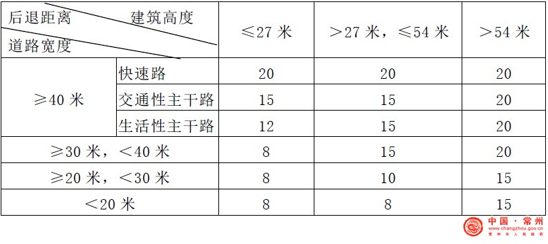 第九条 住宅建筑物后退城市道路红线的最小距离应符合下表要求: