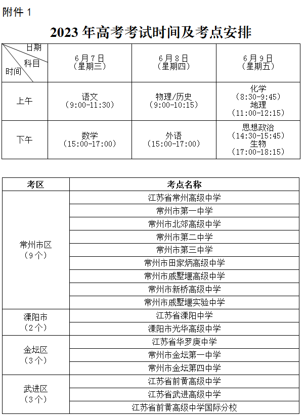 1.2023年高考考试时间及考点安排