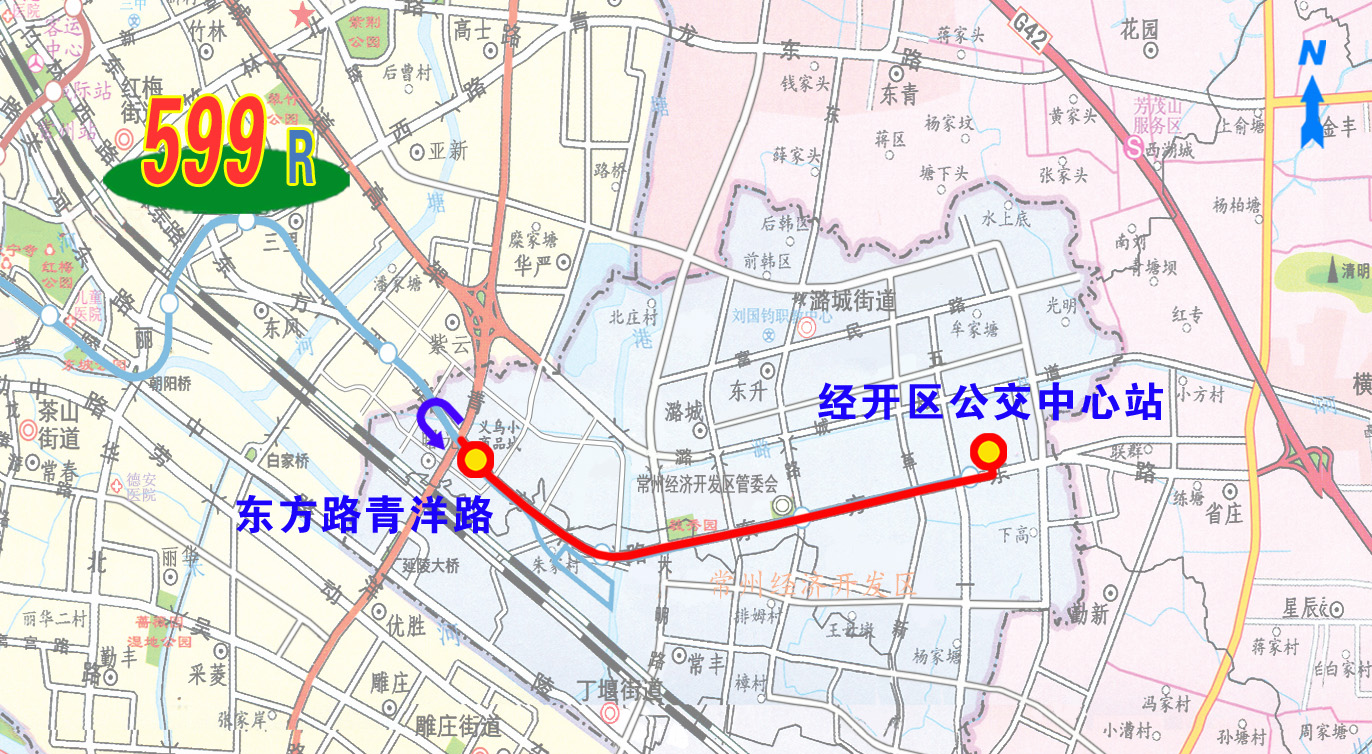 599路:由经开区公交中心站始发,经东方路,至东方路青洋路路口返回。沿途停靠东方路五一路、东方路常青路、地铁潞城站东、常州经济开发区管委会、东方路华丰路、白金汉爵、东方路丁塘河西路、东方路湾城路、东方路曙兴路、东方路青洋路(东行)等站。