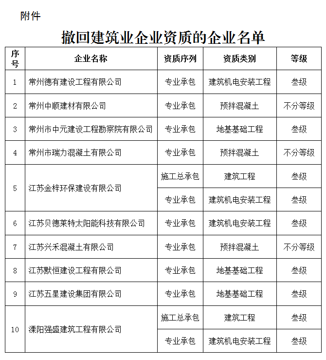 常州德有建设工程有限公司等 10家建筑业企业(涉及 12项市级行政许可建筑业企业资质)(见附件)未在整改期内按照建筑业企业资质标准要求完成整改,我局决定自发文之日起撤回其相应的建筑业企业资质。