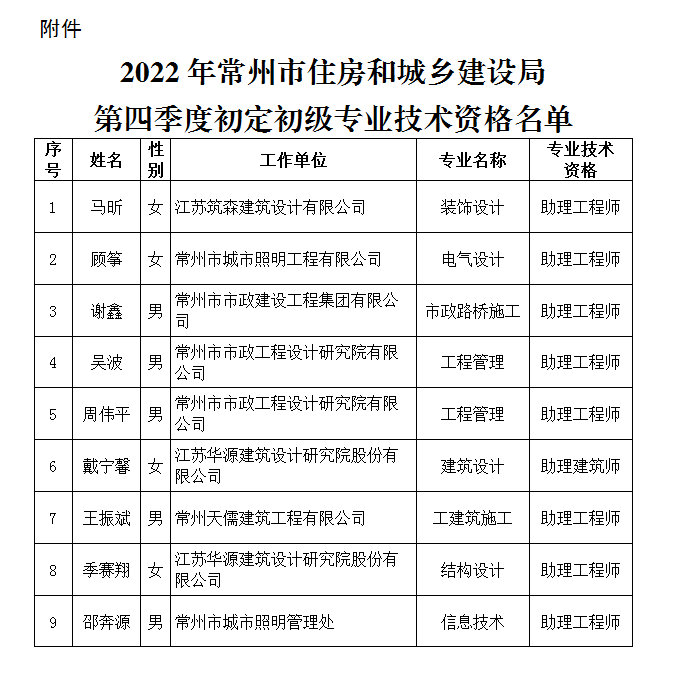 附件:2022年澳门网络十大博彩公司住房和城乡建设局第四季度初定初级专业技术资格名单