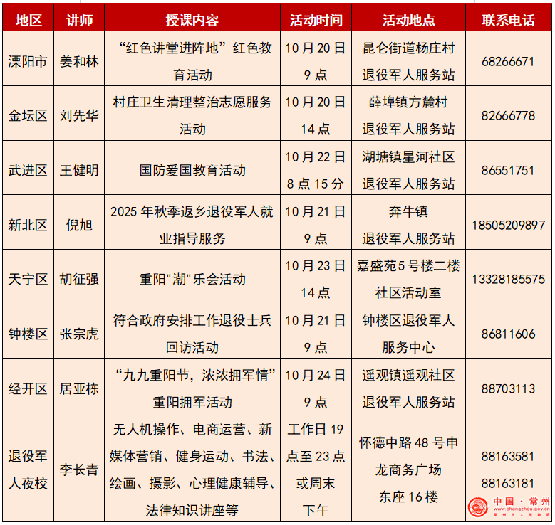 自2025年8月1日起,新增退役军人夜校服务清单,由常州慧迪职业培训学校具体承办,课程涵盖无人机操作、电商运营、新媒体营销、书法、绘画、摄影、心理健康辅导、法律知识讲座等多领域,所开设的课程可向全市退役军人免收学费两门。