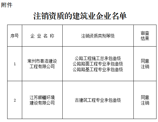 根据《建筑业企业资质管理规定》(部令第22号)和《建筑业企业资质管理规定和资质标准实施意见》(建市〔2015〕20号)等文件要求。依企业申请,我局对2家企业注销材料进行审查,现将审查结果予以公布。