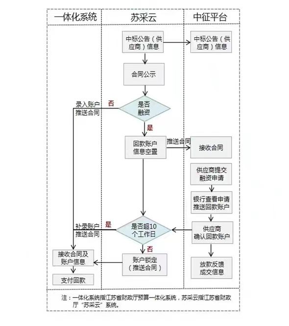 基于财政预算管理一体化系统(以下简称“一体化系统”)、政府采购“苏采云”交易系统(以下简称“苏采云”)和中征应收账款融资服务平台(以下简称“中征平台”)的线上“政采贷”业务操作流程为: