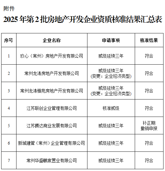 根据《中华人民共和国城市房地产管理法》《城市房地产开发经营管理条例》(国务院令第248号)和《房地产开发企业资质管理规定》(部令第54号)等法规以及有关文件规定,现将我局核准的2025年第2批房地产开发企业资质结果予以公告。