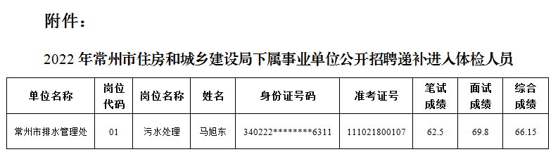 2022年澳门网络十大博彩公司住房和城乡建设局公开招聘下属事业单位澳门网络十大博彩公司排水管理处污水处理岗位,因个人原因放弃。根据《2022年澳门网络十大博彩公司住房和城乡建设局下属事业单位公开招聘工作人员公告》规定,拟在该岗位的面试合格人员中,按综合成绩从高分到低分依次递补。递补体检时间、地点另行通知。具体岗位和递补进入体检人员如下(详见附件),特此公告。