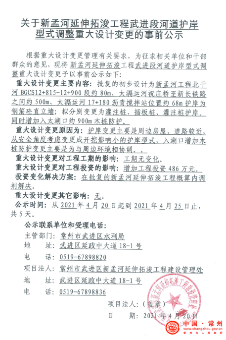 关于新孟河延伸拓浚工程武进段河道护岸型式调整重大设计变更的事前公示