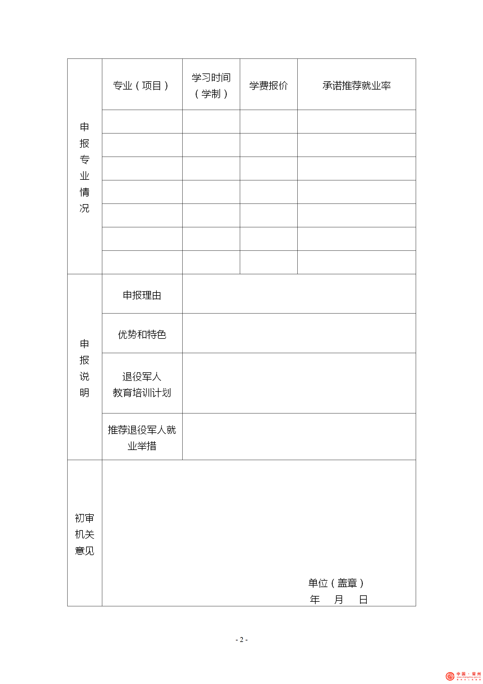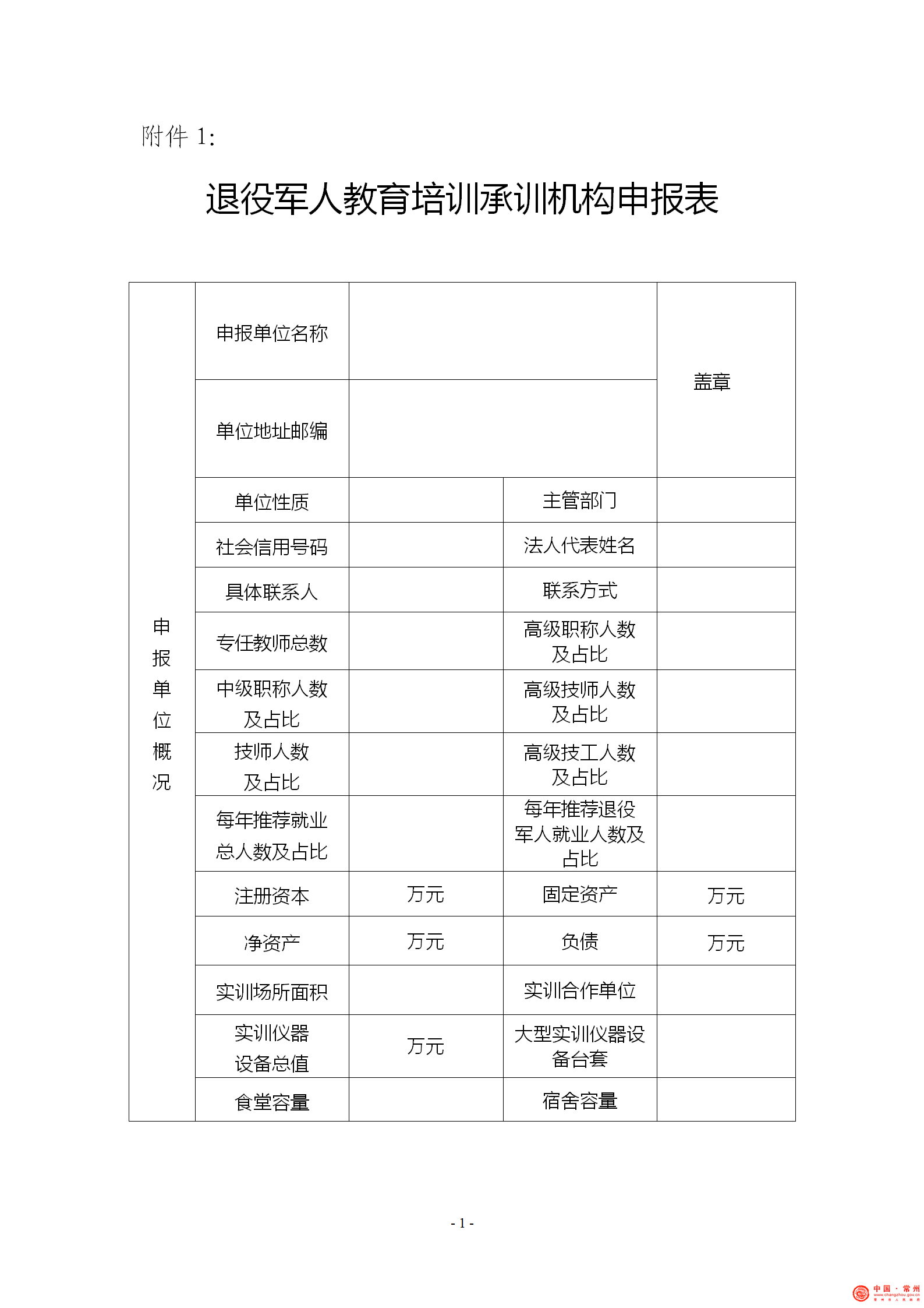 (三)申报需提供材料:培训机构相关资质(包括培训机构法人身份证、办学许可证、承接政府补贴性培训项目资质、登记证书或营业执照等),教学场地所有权证(租用场地需提供租赁协议),设施设备清单,师资及管理人员名册、管理制度等;以上相关证明资料需提供原件及复印件,复印件装订成册并加盖公章,原件经核对后现场退回。并填写《退役军人就业创业培训承训机构申报表》(一式三份)。