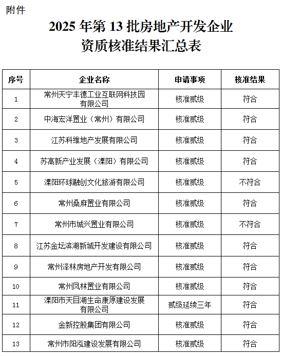 根据《中华人民共和国城市房地产管理法》《城市房地产开发经营管理条例》(国务院令第248号)和《房地产开发企业资质管理规定》(部令第54号)等法规以及有关文件规定,现将我局核准的2025年第13批房地产开发企业资质结果予以公告。