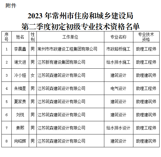 附件:2023年网络十大博彩公司住房和城乡建设局第二季度初定初级专业技术资格名单