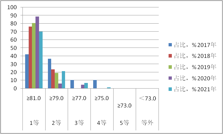 图2 近五年网络十大博彩公司秋季收货稻谷分等占比图