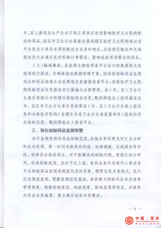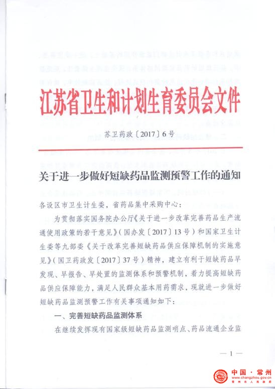 现将省卫生计生委《关于进一步做好短缺药品监测预警工作的通知》(苏卫药政〔2017〕6号)转发给你们,并就做好我市短缺药品监测预警工作要求如下,请一并执行。
