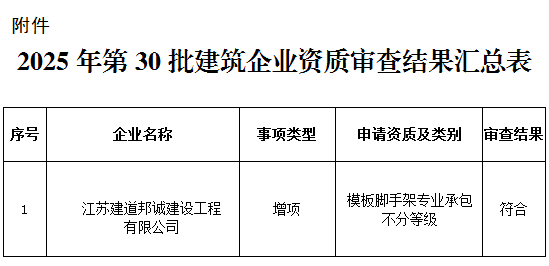 根据《中华人民共和国建筑法》、《中华人民共和国行政许可法》、《建筑业企业资质管理规定》(部令第22号)、《建筑业企业资质标准》(建市〔2014〕159号)等法规及有关规定,现将我局审查的2025年第30批建筑业企业资质结果予以公告。