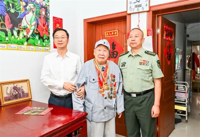 103岁高龄的王永贵,1940年在抗日战争苏南根据地入党,曾任新四军二团三营九连指导员、炮兵连长、720师炮营副政治教导员,后参加淮海战役、渡江战役。王永贵精神矍铄、耳聪目明,胸前佩戴的抗战胜利80周年纪念章熠熠生辉。王剑锋细心询问老人生活起居和健康状况,听他讲述革命经历,祝愿老人身体健康、生活幸福。