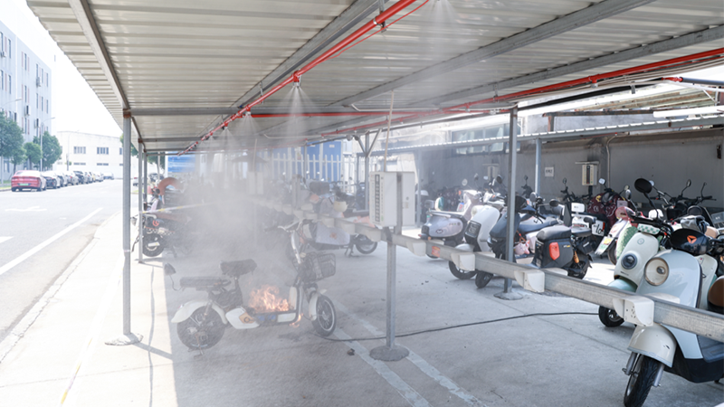 随着一阵急促的警报声响起,位于新北区的大坝科技园电动自行车棚内,一台正在充电的电动车电池突然冒出浓烟。就在火苗即将窜出的瞬间,车棚顶部的喷雾装置自动启动,透明喷雾精准覆盖车辆,仅8秒火情就被彻底扑灭,且无复燃迹象。