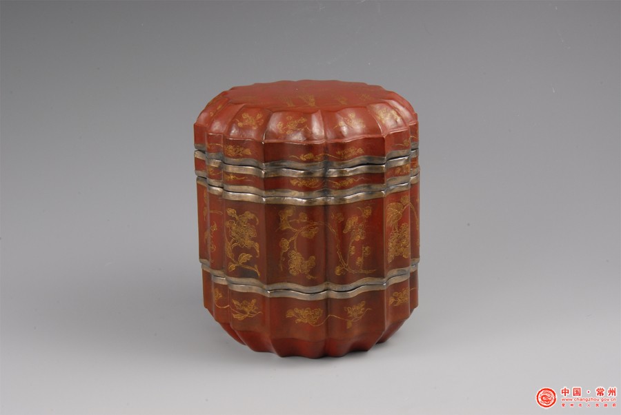 奁是中国古代女子用以盛放梳妆工具的化妆盒,许多宋词与宋画中都展示了一些宋代漆奁形象。而常州博物馆珍藏的这件朱漆戗金莲瓣式人物花卉纹漆奁,则是如今存世的实物奁盒中极为优美雅致的代表。它呈十二棱莲瓣式筒状,通高21.3、直径19.2厘米,木胎,由盖、盘、中格、底格多层扣合而成,通体外髹朱漆,内髹黑漆,合口处口沿均镶包银扣。盖面为戗金仕女消夏图,奁身四周十二棱间戗刻有荷花、牡丹、梅花、山茶、莲花等六组折枝花卉。奁盖内黑漆底上,有朱漆书写十字铭文一行。漆奁出土时承装着铜镜、木梳、竹篦、竹剔子、粉盒、胭脂盒、香盒等妇女日常打理妆容的用品。