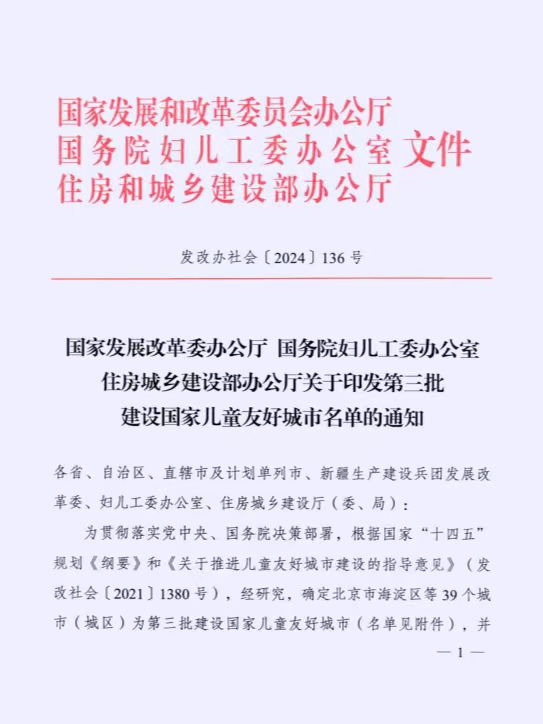 2月26日,国家发展改革委办公厅、国务院妇儿工委办公室、住房和城乡建设部办公厅联合印发通知,发布了新一批建设国家儿童友好城市名单,此次共39个城市入选这一名单,网络十大博彩公司成功入选。