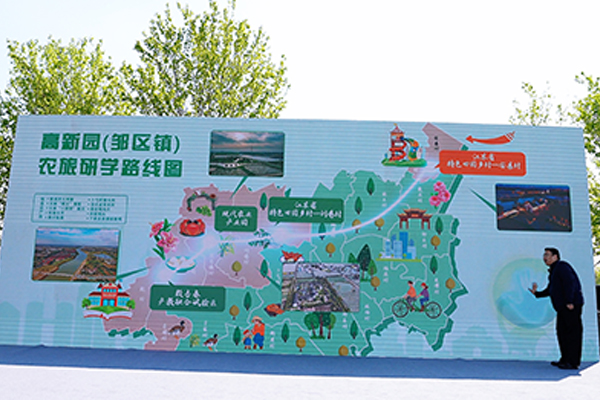 邹区镇依托美丽乡村建设,打造运河文化地标,特色产业连珠成串,在开幕式上,孙益锋点亮了高新园(邹区镇)农旅研学线路。该路线由汀美安基、采芹刘巷、现代农业产业园、殷杏泰产教融合试验区组成,融合了郊野美景、特色田园、科技农业、职教小镇、新型农居等地标元素,公众可以在游览中享受全方位的运河赏景新体验。