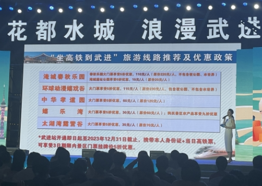 开幕式上进行了“坐高铁来武进”旅游线路推介和优惠政策发布。自武进站开通之日起到12月31日,到达武进站的游客持本人当日车票和身份证件,可以享受3日内淹城春秋乐园、环球动漫嬉戏谷、中华孝道园、太湖湾露营谷、嬉乐湾生态休闲区5家景区大门票挂牌价5折优惠。