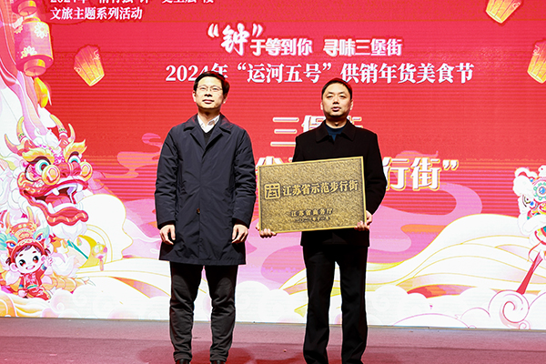罗庆彦为三堡街“江苏省示范步行街”授牌。