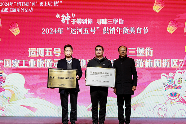 田海明为运河五号“国家工业旅游示范基地”、三堡街“国家级旅游休闲街区”授牌。