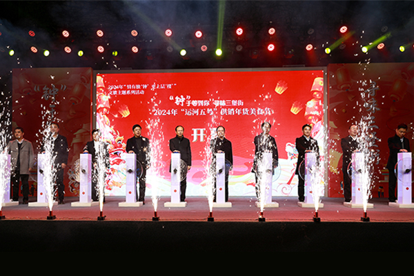 活动最后,随着薛建忠等领导上台进行开幕仪式,“钟”于等到你 寻味三堡街—2024年“运河五号”供销年货美食节正式开幕。