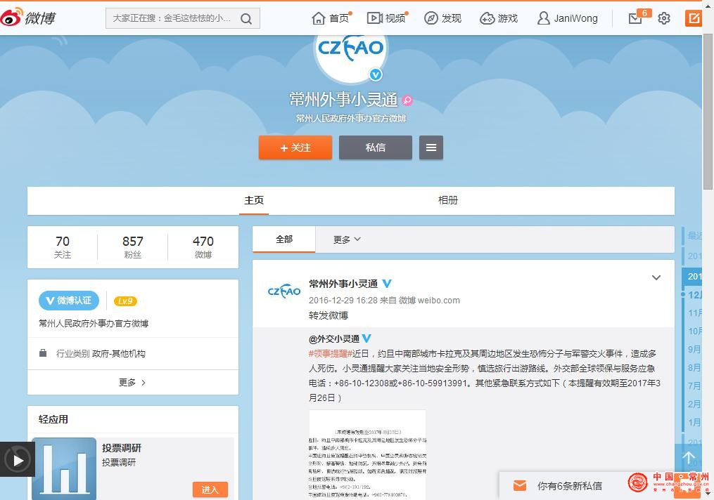 三是丰富载体建设。我办门户网站围绕市委、澳门网络十大博彩公司的中心工作,认真宣传、贯彻党的外事工作方针政策。及时将外事政策法规、外事工作动态、对外交流合作成果等第一时间在本办网站上发布,为领导掌握信息、正确决策、推动工作提供了可靠依据,为各部门协调沟通、相互交流搭建了平台,为广大网民了解外事、参与外事提供窗口。进一步简化网上业务办理和资料下载流程,优化版面布局,方便企业群众在线咨询和办理有关业务;答复网上咨询留言18条,及时解答回应群众关心的问题,方便我市企业机构和广大市民准确掌握信息,助力全市对外交往合作。通过微博等公共平台发送领保信息,及时传达与市民紧密相关的领事保护信息,为市民在外工作、生活、旅游保驾护航。