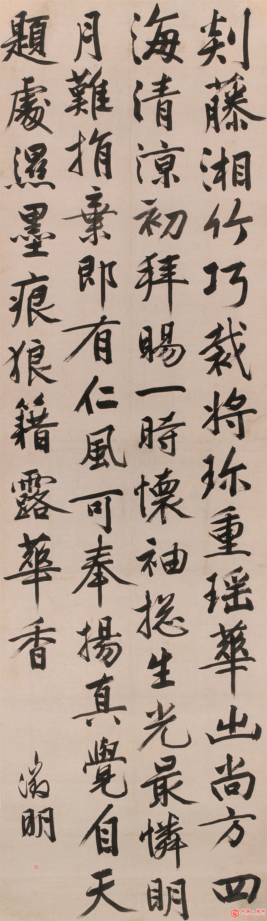 文征明书法造诣深厚,一生临学精博,中岁以后已篆隶楷行草各体兼工,小楷尤为人称道,有“名动海内”之誉。晚年他的行书转向黄庭坚,尤以大字为多。此件行书七律诗轴,即是他晚年师法黄庭坚的巨幅力作,其长度近350厘米,宽90.8厘米,如此巨轴,较为少见。虽然尺幅超长,但绝无怯弱之态,用笔沉稳,笔力苍茫;体势上中宫收紧,四面开张,犹如长枪大戟;章法上大小错落,轻重有致,尽显不凡。