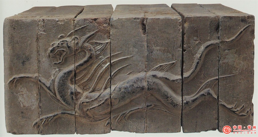 龙纹砖,大张口,长吻,长舌外露,头顶长有分支的双角,细长颈,身体弯曲,长尾上扬,背部、尾端及四肢关节处生有飘动的飞鳍,身躯雄健有力,做凌空腾飞状,展示出与众不同的瑞兽气势。常州别号“龙城”,我馆以此龙纹加以变化,与馆藏国宝级文物南宋戗金漆奁相结合,作为新的馆标,创意满满,寓意深远。