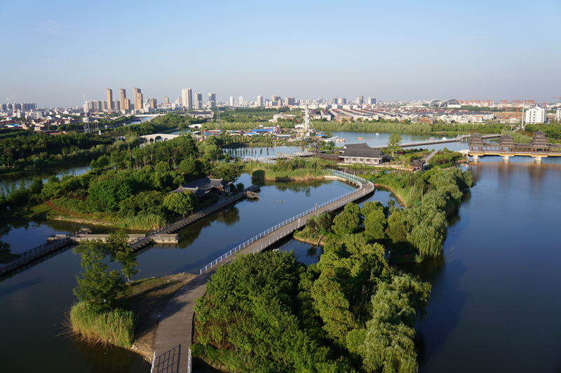 公园充分利用现有湿地条件,保留原有河道、巧妙运用现代造园的简约理念、又与传统一脉相承,并以水杉、落羽杉、垂柳、芦苇、黄菖蒲、千屈菜、海寿花、水葱、菱、睡莲、荷花等耐水湿植物着重打造湿生、挺水、浮水、沉水植物的景观特色。公园的又一大特点是桥梁众多,玉带桥、五亭桥、石拱桥