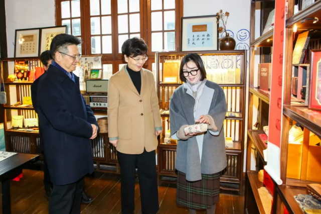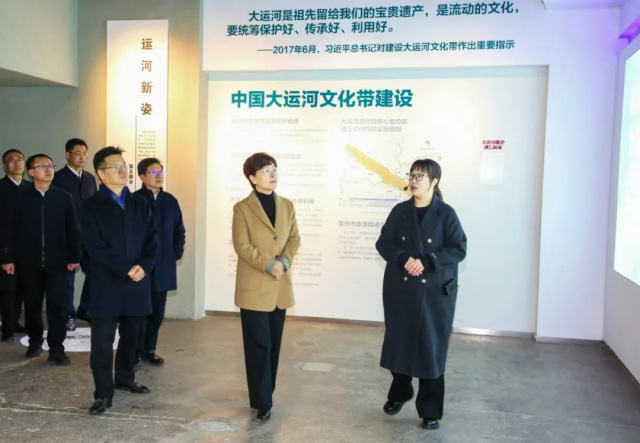 徐缨一行首先来到运河五号创意街区,实地察看恒源畅书坊、大运河记忆馆、运河五号剧场、五号美术馆等地,详细了解策展布展、文创设计、活动举办等运营情况。街区在原常州第五毛纺织厂基础上以“保护、利用、再生”理念进行建设,如今已成为艺术汇聚、氛围独特的文创产业发展平台。徐缨强调,要总结好、发展好、利用好这一运河工业遗存保护的成功案例,打造历史韵味浓厚、现代功能齐备的文化“会客厅”,为市民提供特色鲜明的文化生活空间;要结合本地特色,更大力度设计制作文创产品、特色礼品,全方位展现常州历史文化风貌,让更多具有标识度、记忆点的产品带着常州城市形象更好“走出去”;要为本地文艺工作者、青年艺术家提供更广阔的成长空间和展示舞台,充实文化人才资源,提升常州文化发展的内生动力。