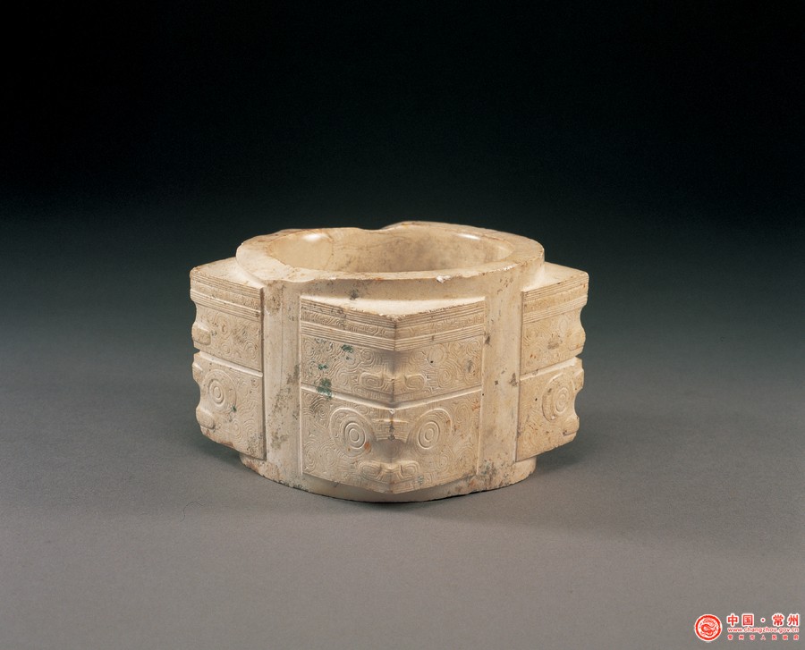 这件玉琮出土于江阴高城墩。乳白色,整体为矮方柱形,内圆外方,分为上下两节,四周线刻浅浮雕,共四组图案。每组上节饰戴羽冠人面纹,下节为兽面纹。兽面纹眼大、獠牙外露,较抽象。人面兽面纹周围以繁密的卷云纹作地纹。这种兽与人结合的图案被认为是良渚文化的神徽。玉琮是统治阶级祭祀苍茫大地的礼器,也是巫师通神的法器。这件玉琮由透闪石琢制,玉质滋润,琢磨精细,器形规整,线条繁缛流畅、通体打磨光洁,工艺精湛,体现了良渚玉器的高度成就,独特的纹饰不仅给人神秘的美感,更为后世研究当时的文化和宗教提供了重要依据,为良渚文化典型精品。