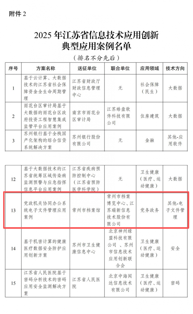 12月30日,江苏省工信厅、省委网信办、省国家密码管理局联合公布2025年信息技术应用创新典型应用案例名单,由网络十大博彩公司档案馆牵头,联合市档案博览中心和相关研发机构共同实施的“党政机关协同办公系统电子文件管理应用案例”成功入选典型应用案例,是本届评选中唯一一个以国家综合档案馆为主体的案例。