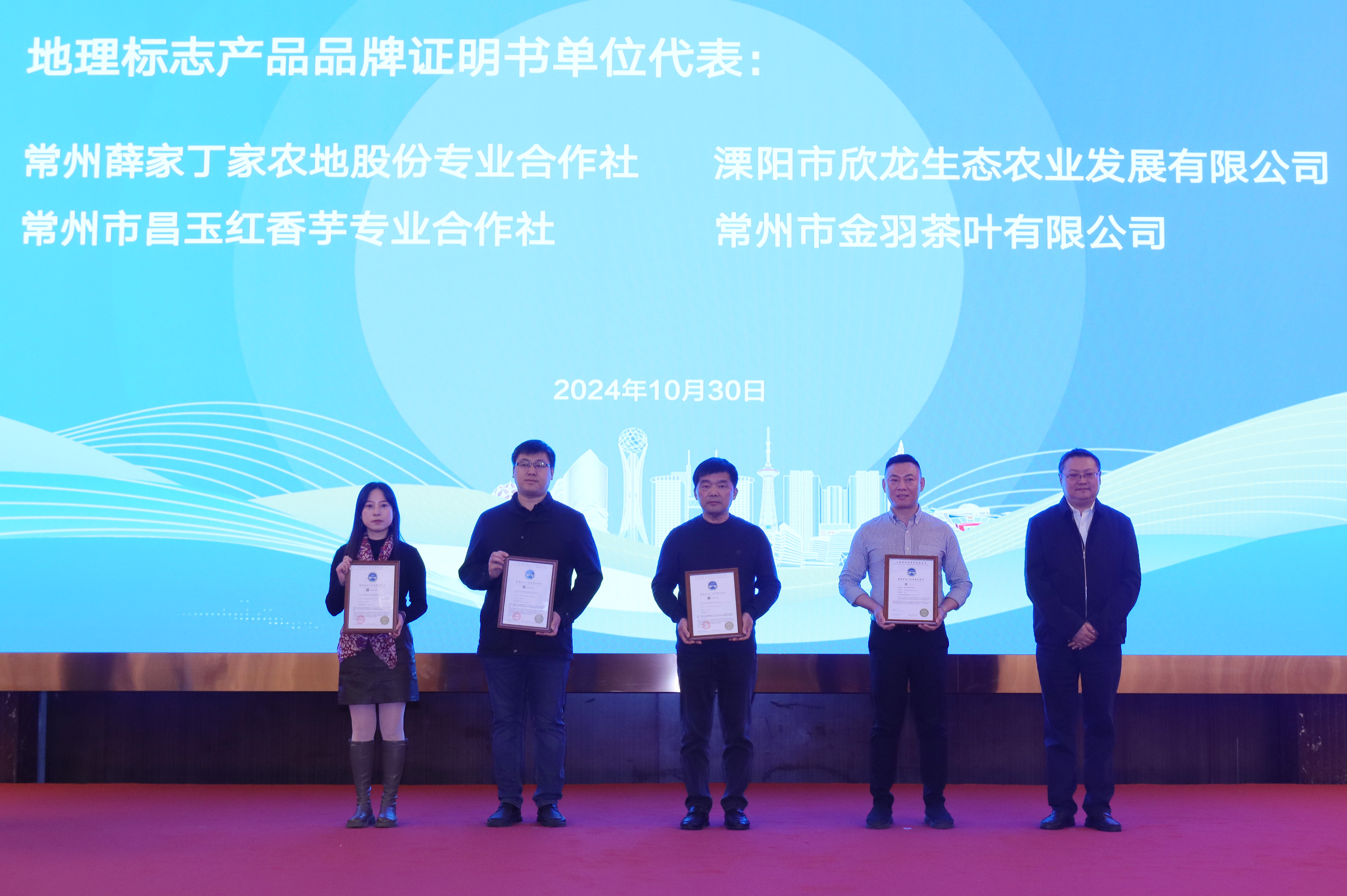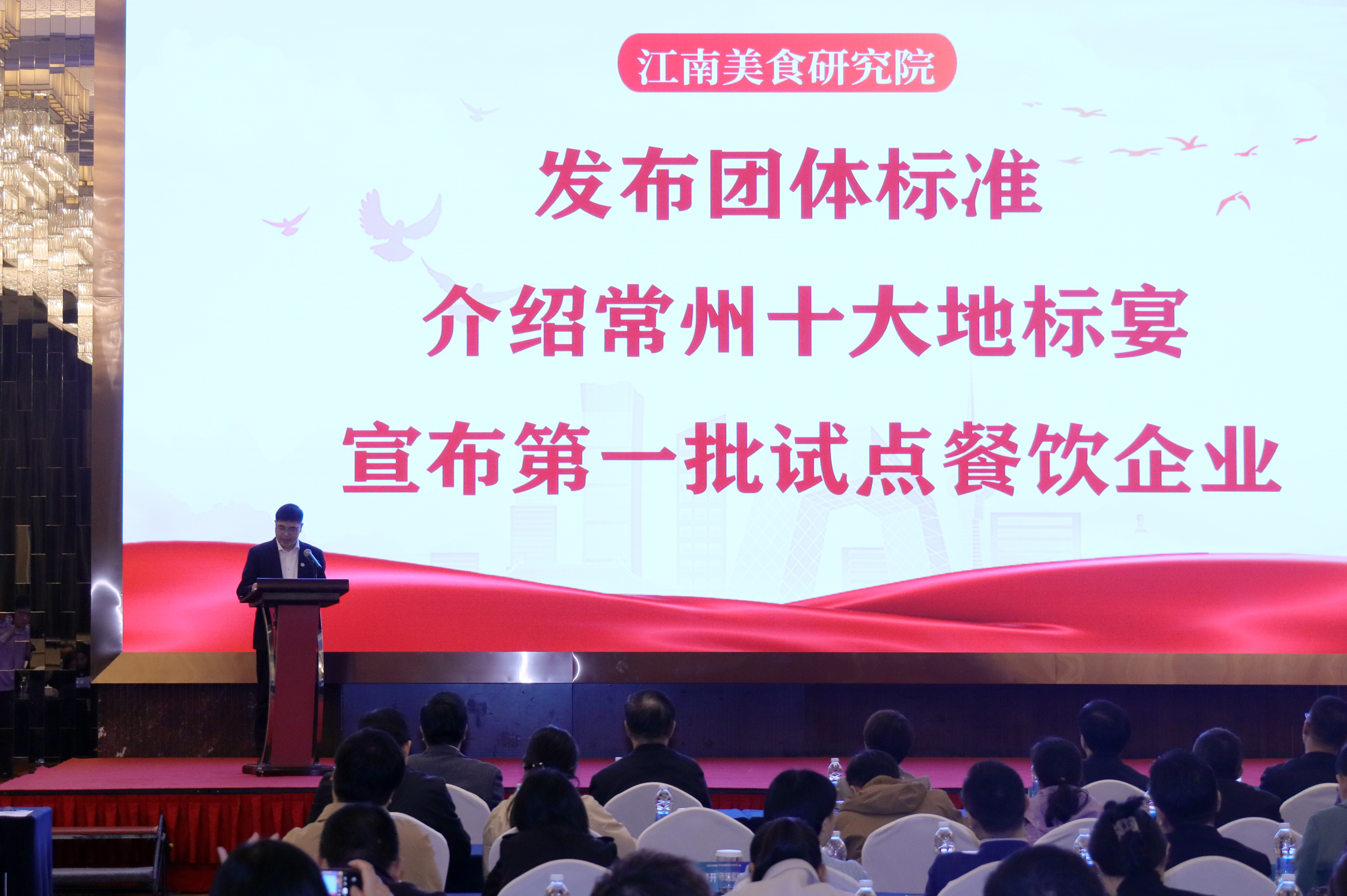 会议现场发布“常州地标宴”及《常州地标美食评定规范》团体标准,分别为获得《地理标志产品品牌证明书》认证的4家企业和6家“常州地标宴”试点企业授牌。