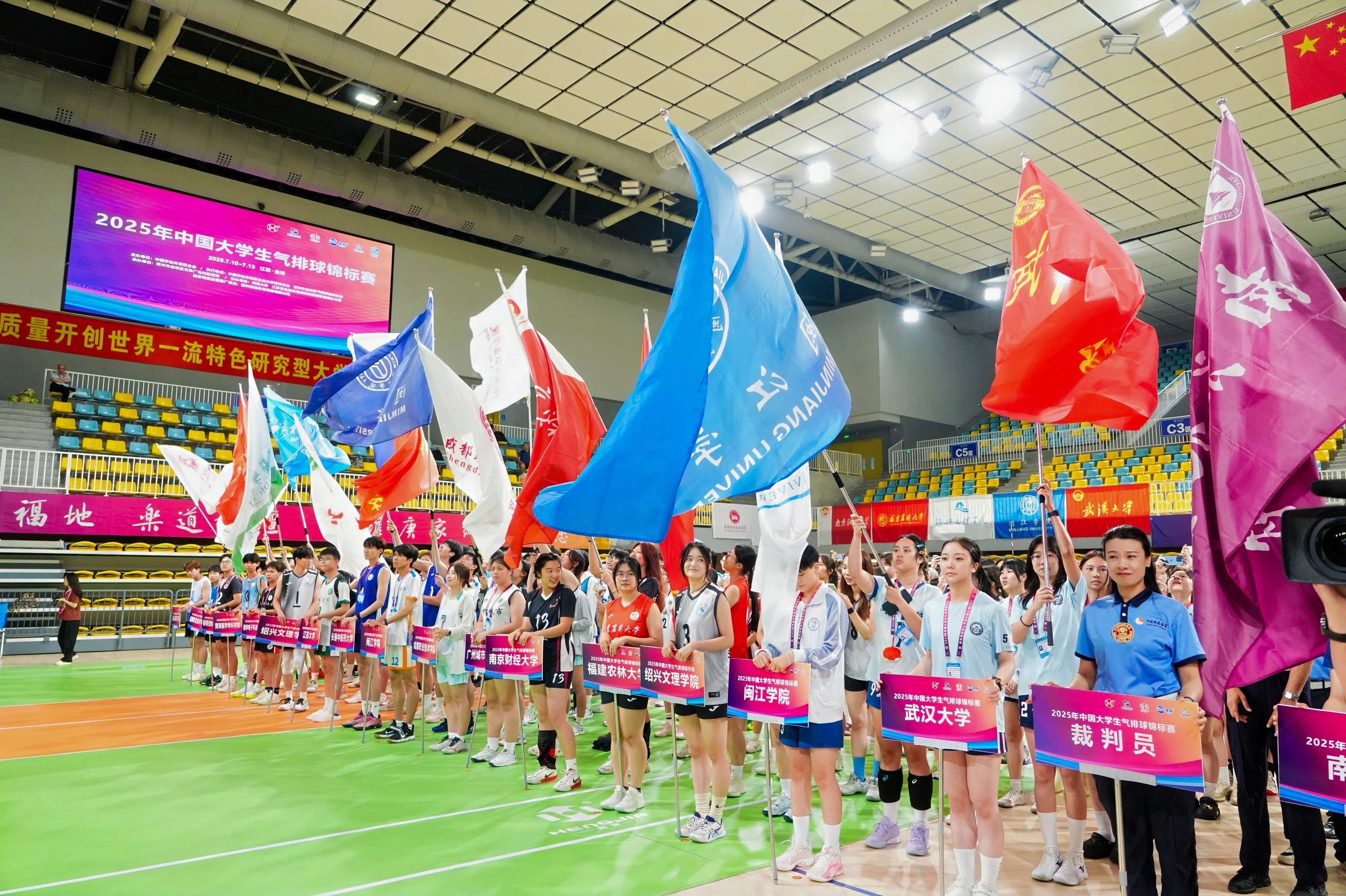 7月10日上午,2025年中国大学生气排球锦标赛在金坛打响。来自全国各大院校的33支队伍,410名运动员、裁判员齐聚河海大学常州校区体育馆,将在为期四天的激烈角逐中挥洒青春汗水,展现当代大学生的活力风采与竞技激情。